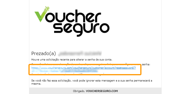 PASSO 05: No conteúdo do e-mail recebido, clique no link presente no corpo para ser redirecionado ao site da Voucher Seguro e alterar sua senha.