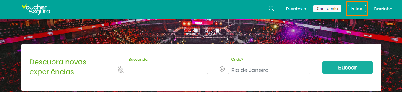 PASSO 01: Na Página inicial da Voucher Seguro, dirija-se até o campo "Entrar" indicado na imagem abaixo, localizado no topo de sua tela.