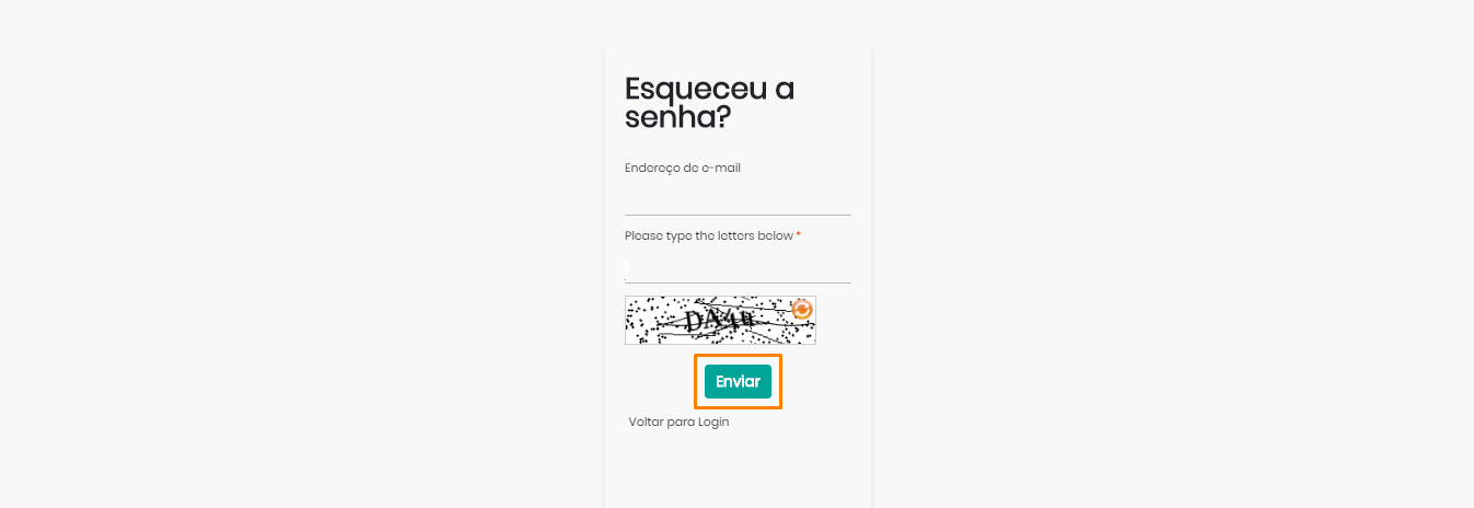 PASSO 03: Você será indicado a preencher o campo com o seu e-mail e o captcha de segurança. Insira o mesmo e-mail com o qual a sua conta foi registrada e clique em “enviar”.